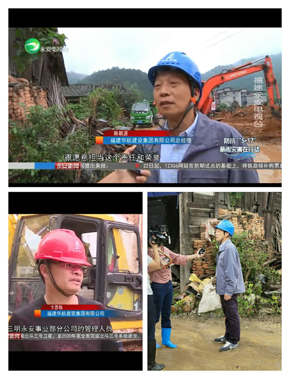 陈朝源、陈泽彬、方剑玲等集团领导、救灾工作组一行赶赴小陶镇救灾现场,安排部署现场救灾工作,慰问一线救灾干部员工。作为参加救灾企业典型之一,陈朝源董事(原公司总经理)代表集团接受永安市电视台采访。陈朝源董事向当地救灾指挥部表示,华航集团作为一家拥有特级资质的建筑企业,将一如既往以社会责任为已任,全力以赴、不折不扣完成各项救灾任务。救灾工作组还鼓励华航一线救灾团队,持续发挥华航勇于担当、能打硬仗的光荣传统,为永安救灾更多地贡献华航力量和真情。