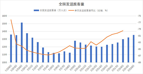 大数据下看全国复工进度条,节后返程速度开始缓慢回暖。2月14日至2月20日,全国累计发送旅客8900万人次,每日客流量均实现环比增长,日均增速2%。单日客运量同比降幅逐渐收窄至80%以内,返程速度逐渐加快。