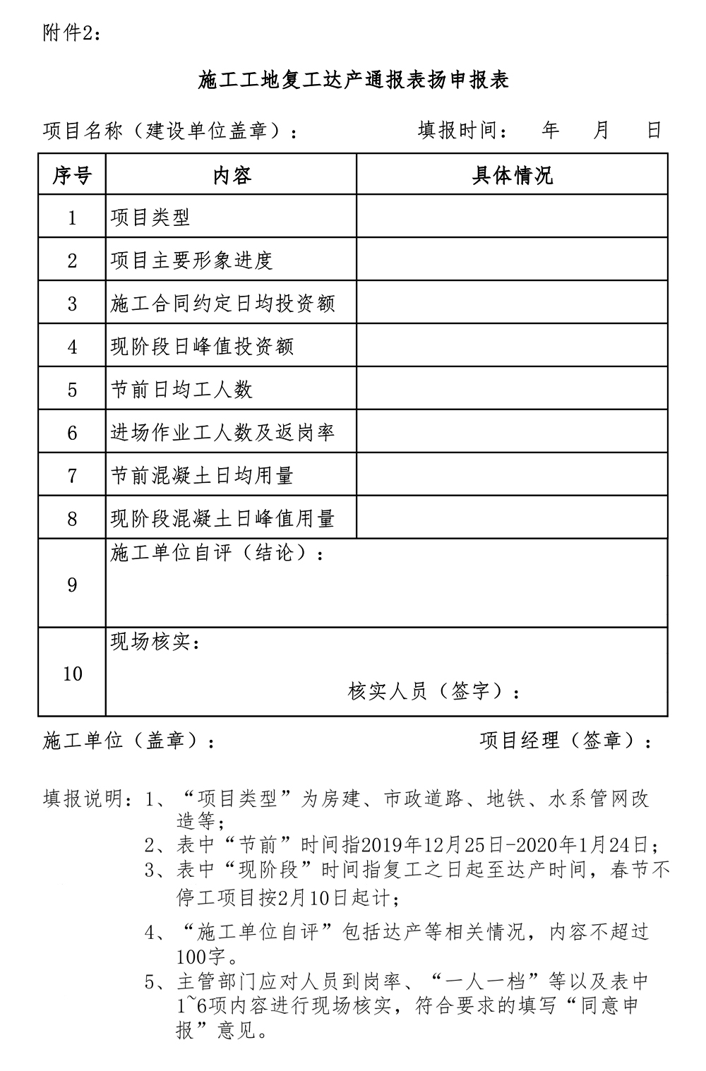 2、《施工工地复工达产通报表扬申报表》