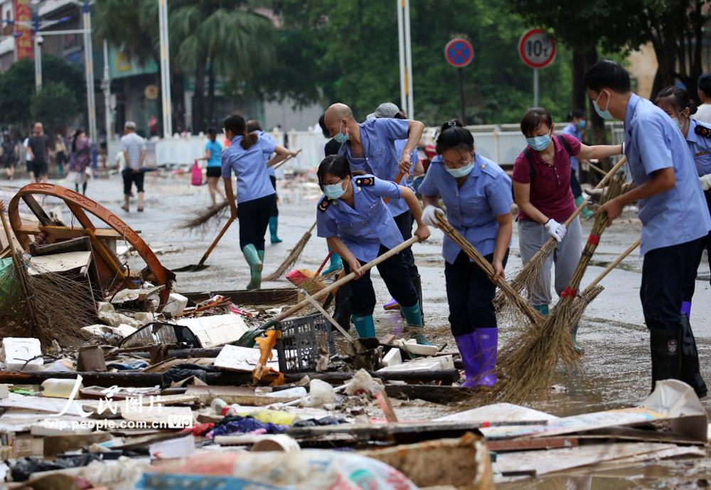 7月12日,在广西融水苗族自治县县城,市场监督管理局干部在清理灾后垃圾。(龙林智/人民图片)
