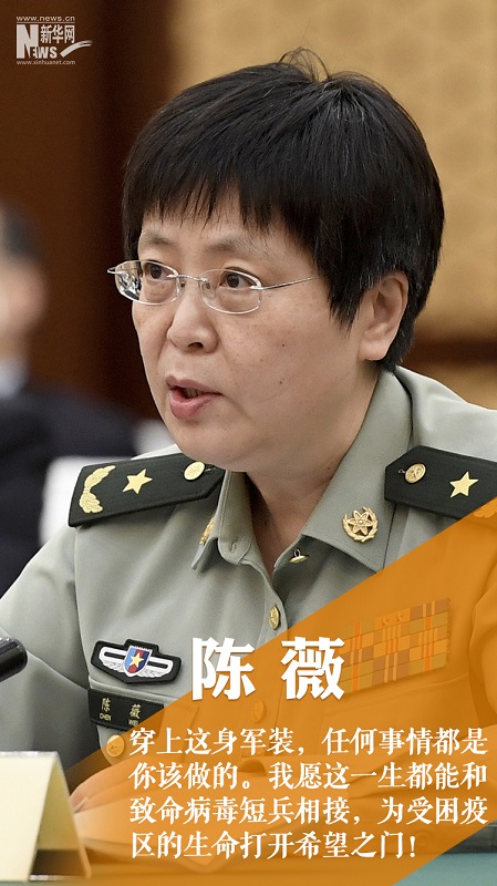 陈薇长期致力于生物危害防控研究,研制出我军首个SARS预防生物新药“重组人干扰素ω”、全球首个获批新药证书的埃博拉疫苗。新冠肺炎疫情发生后,她闻令即动,紧急奔赴武汉执行科研攻关和防控指导任务,在基础研究、疫苗、防护药物研发方面取得重大成果,为疫情防控作出重大贡献。荣获“全军防治非典先进个人”“全国十大杰出青年”等称号。
