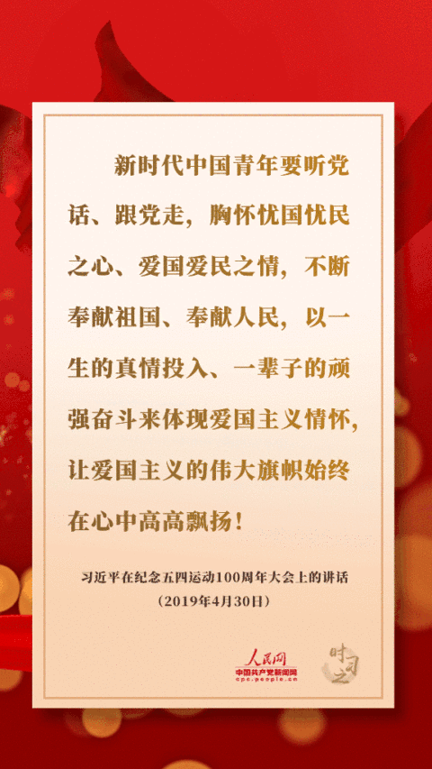 新时代中国青年要听党话、跟党走,胸怀忧国忧民之心、爱国爱民之情,不断奉献祖国、奉献人民,以一生的真情投入、一辈子的顽强奋斗来体现爱国主义情怀,让爱国主义的伟大旗帜始终在心中高高飘扬!