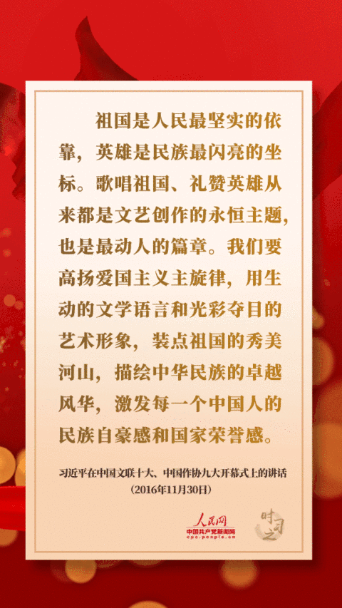祖国是人民最坚实的依靠,英雄是民族最闪亮的坐标。歌唱祖国、礼赞英雄从来都是文艺创作的永恒主题,也是最动人的篇章。我们要高扬爱国主义主旋律,用生动的文学语言和光彩夺目的艺术形象,装点祖国的秀美河山,描绘中华民族的卓越风华,激发每一个中国人的民族自豪感和国家荣誉感。