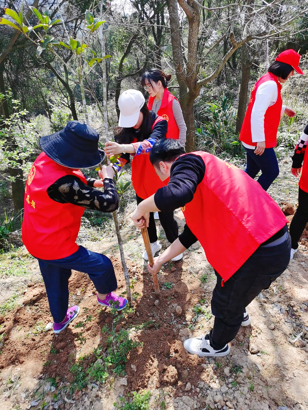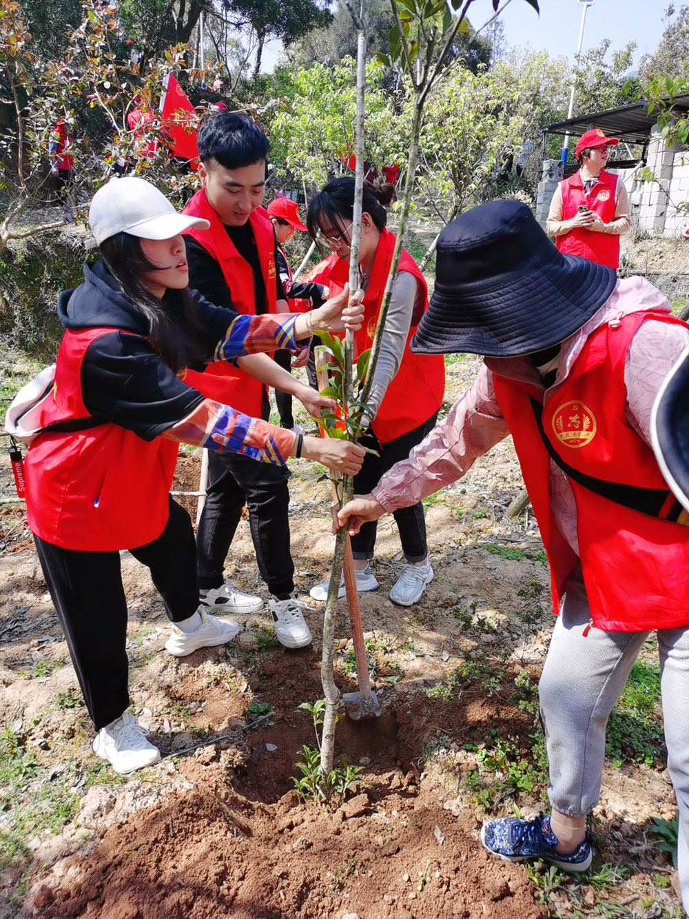 大地春意盎然,山头新绿绽放。一行党员身穿志愿者背心、佩戴党徽,精神饱满、列队出发。一到植树点,大家马不停蹄,在专业人员的指导下,分成小组,挥镐挖坑,精心种上树苗,培土夯实后,浇上水,并挂上华航支部牌子。经过大家的辛勤劳动,一株株新栽的树苗迎风挺立,焕发生机。党员志愿者以自己的实际行动,践行爱绿植绿护绿的文明风尚,为美丽乡村增添一抹新绿,同时也为鲜红的党旗增添一分光辉。