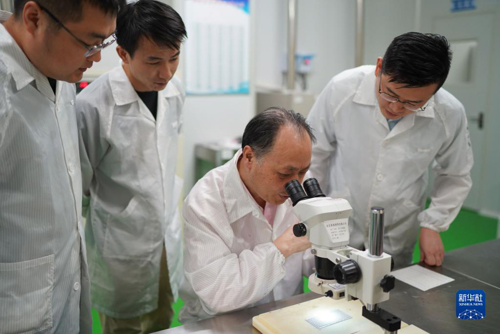 江风益在位于南昌高新区的实验室内与团队成员一起工作(2022年8月5日摄)。新华社记者 周密 摄