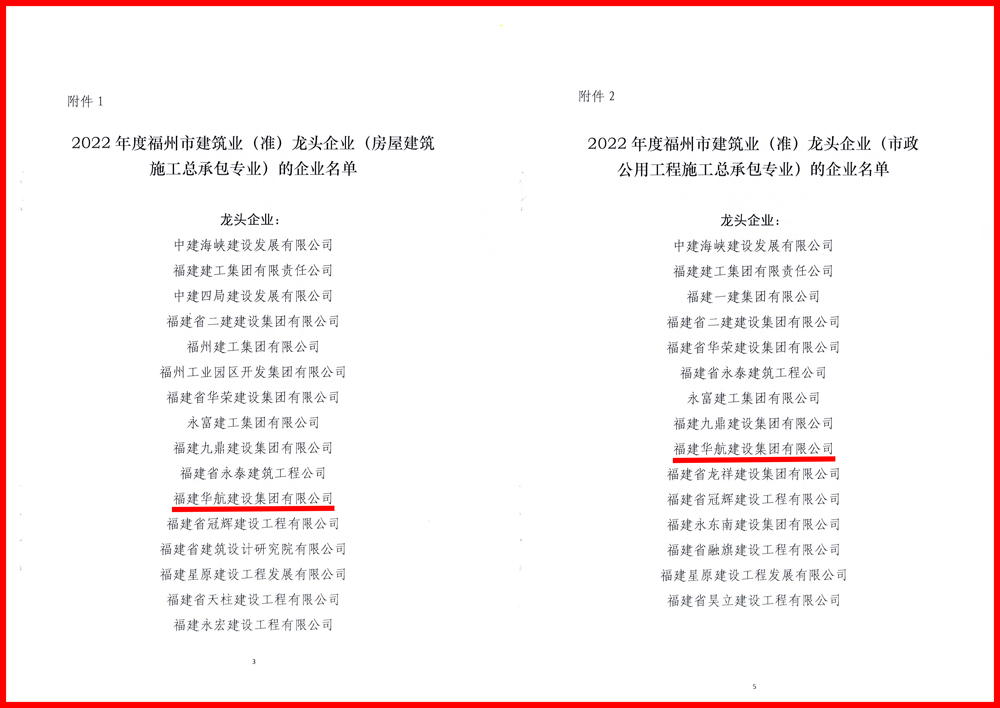 2022年12月1日,2022年度福州市建筑业(准)龙头企业名单发布,福建华航建设集团获评2022年度福州市建筑业龙头企业(房屋建筑施工总承包专业、市政公用工程施工总承包专业)。连续两年被评选为福州市建筑业龙头企业,不仅是对福建华航建设集团经营成果的肯定和鼓励,更将进一步促进企业向前向好快步发展。