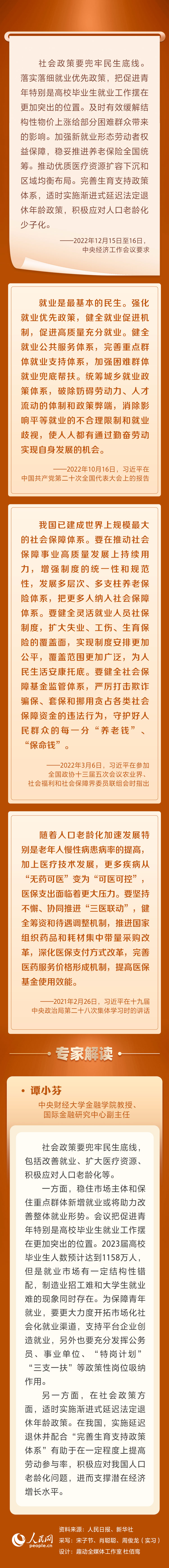 会议要求,明年要坚持稳字当头、稳中求进,继续实施积极的财政政策和稳健的货币政策,加大宏观政策调控力度,加强各类政策协调配合,形成共促高质量发展合力。围绕会议要求的“积极的财政政策要加力提效”“稳健的货币政策要精准有力”“产业政策要发展和安全并举”“科技政策要聚焦自立自强”“社会政策要兜牢民生底线”,人民网梳理习近平相关讲话内容并邀请专家进行解读。本期聚焦“社会政策要兜牢民生底线”。